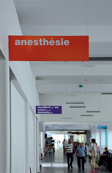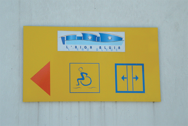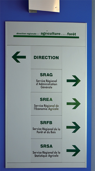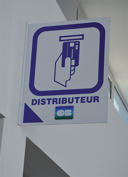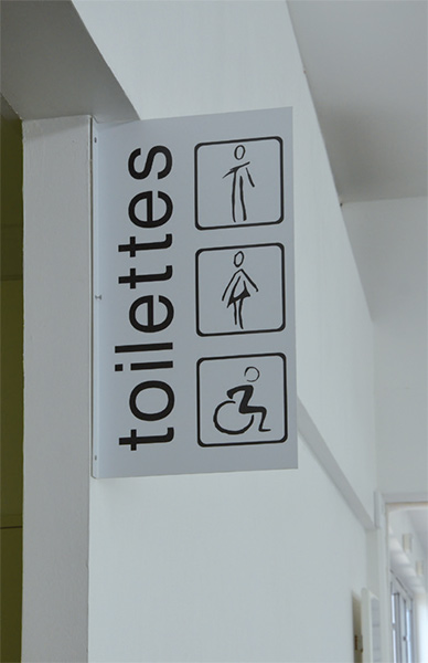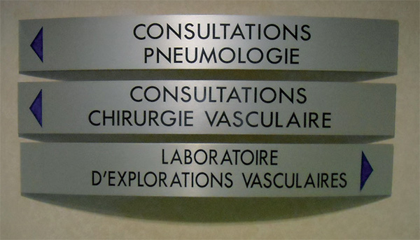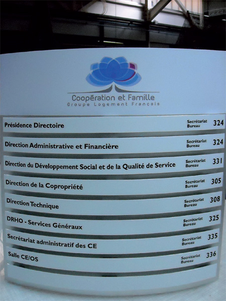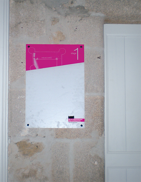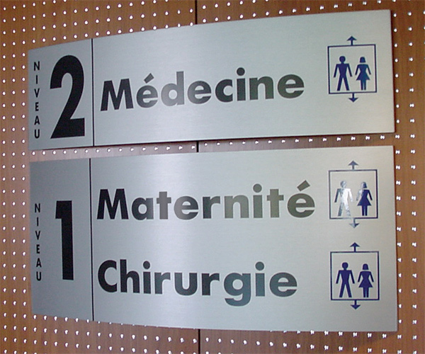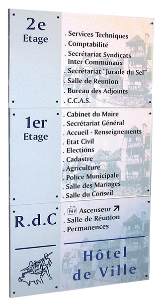 Pictogrammes en drapeau double face sur aluminium anodisé, décor transcript adhésif