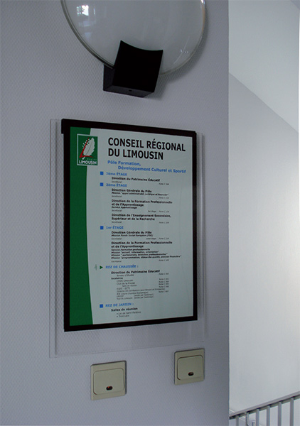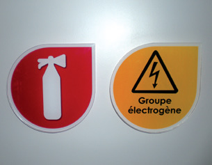 pictogrammes réalisés en plexiglass, décor recto transcript adhésif