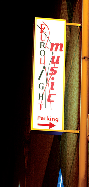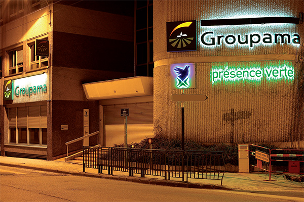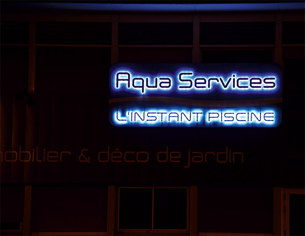 Lettres et logo découpés en PVC, rétro éclairage par diodes bleues et vertes
