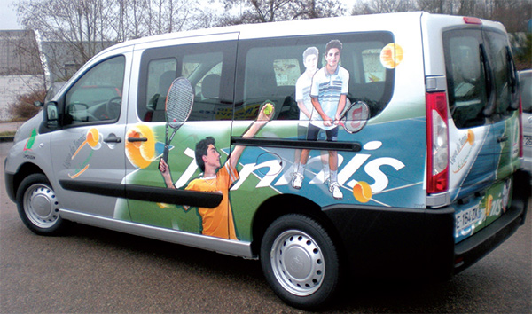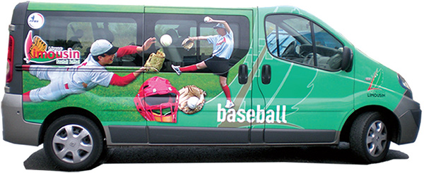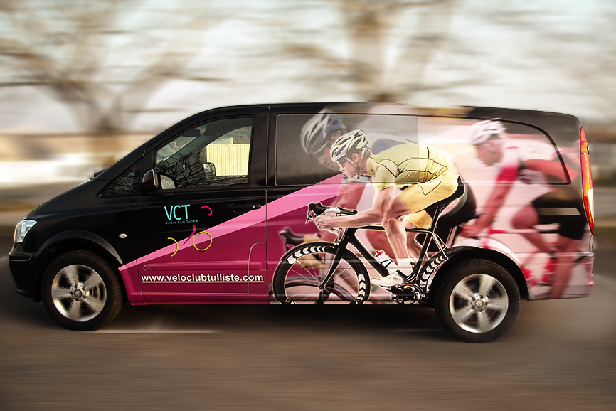 Véhicule de transport sportif , décor réalisé en covering partiel, vinyl micro perforé sur les parties vitrées