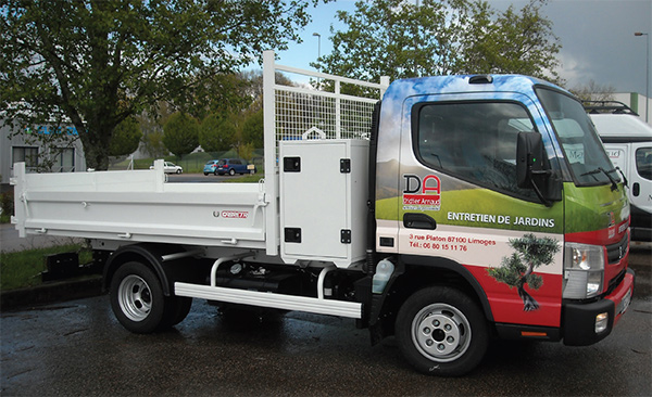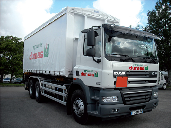 Camion, décor cabine réalisé en transcript adhésif, décor bâche en vinyl adhésif découpé, spécial bâche