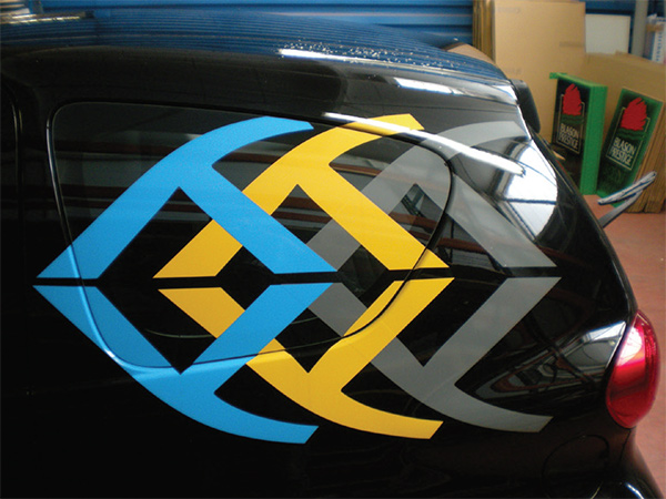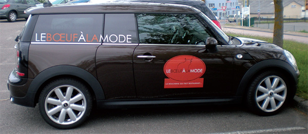 Véhicule de société, décor réalisé en covering total, vinyl micro perforé sur les parties vitrées